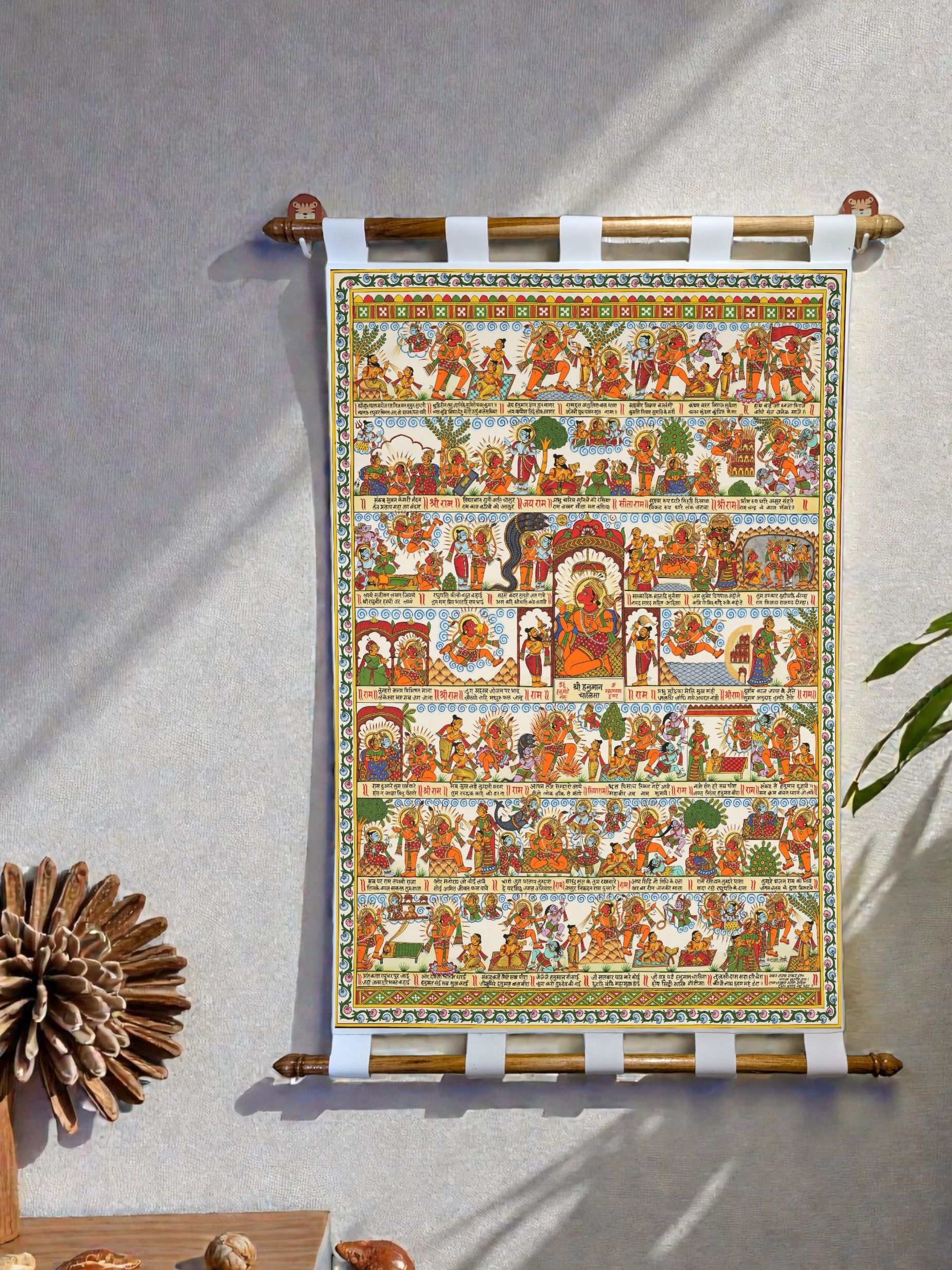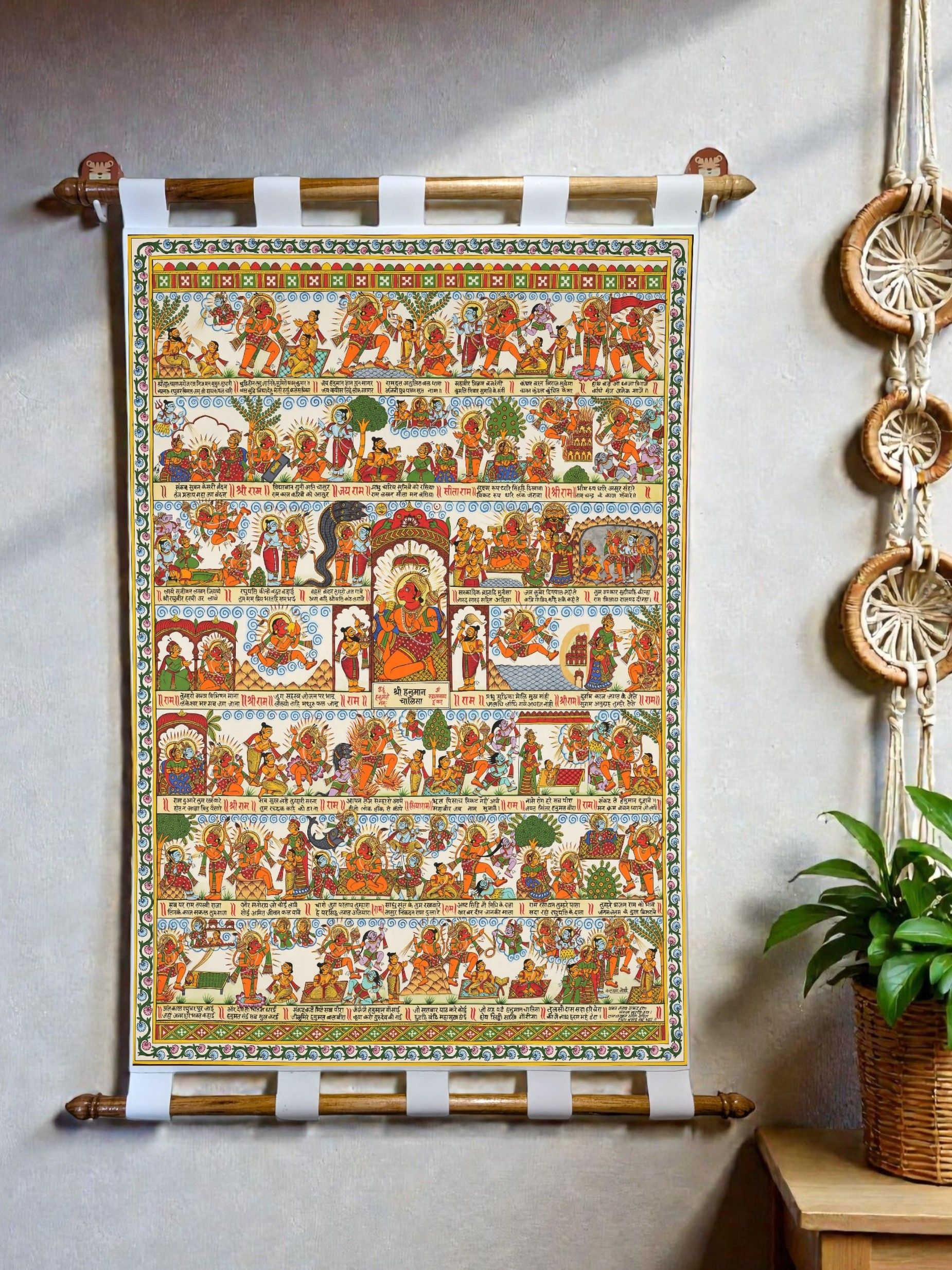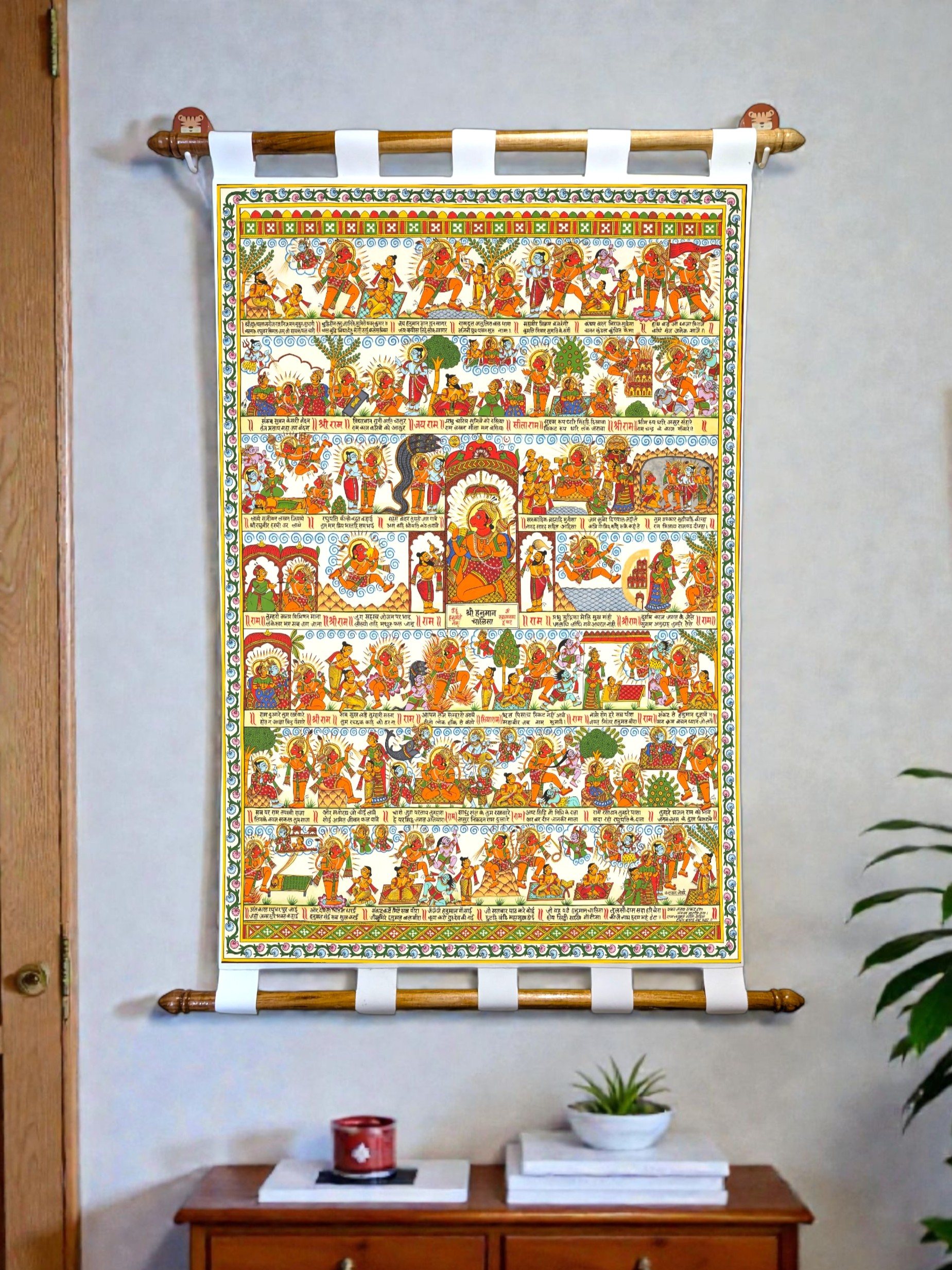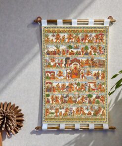 Add a touch of tradition and spirituality to your space with this Phad Hanuman Chalisa canvas scroll painting by Tushaco Handicrafts, inspired by the rich heritage of Rajasthani art. Printed on premium cotton canvas cloth with vibrant, fade-resistant colors, it features beautifully detailed Hanuman motifs and temple elements, making it perfect for pooja rooms, living spaces, offices, and more. The scroll comes ready to hang with sturdy wooden rods and fabric loops, blending elegance with ease of use. A thoughtful gift for festivals, housewarmings, or spiritual occasions, this Indian folk art wall hanging is a timeless piece that brings cultural charm and devotional energy to any setting.
